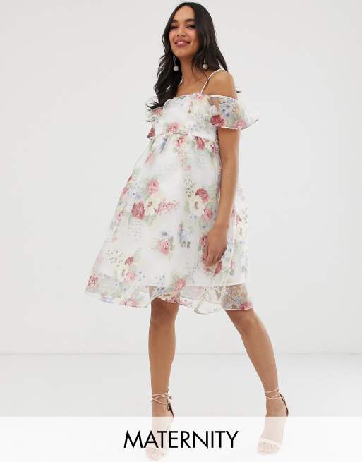 Chi Chi London Umstandsmode Cremefarbenes Geblumtes Kleid Im Bardot Stil Mit Geruschtem Saum Asos